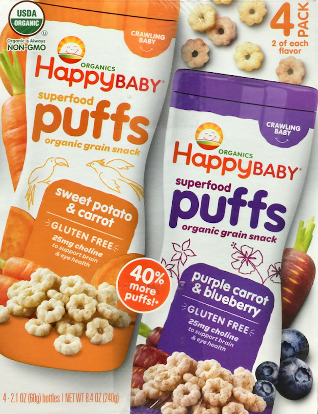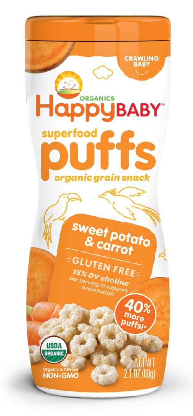 아기 7개월쯤부터 처음 간식으로 먹기 시작했는데 개인적으로 해피베이비 브랜드 제품이 좋았어요.단맛도 거의 없고 손에도 안 붙고 예뻐요.퍼프는 소근육 발달 놀이에도 좋습니다.